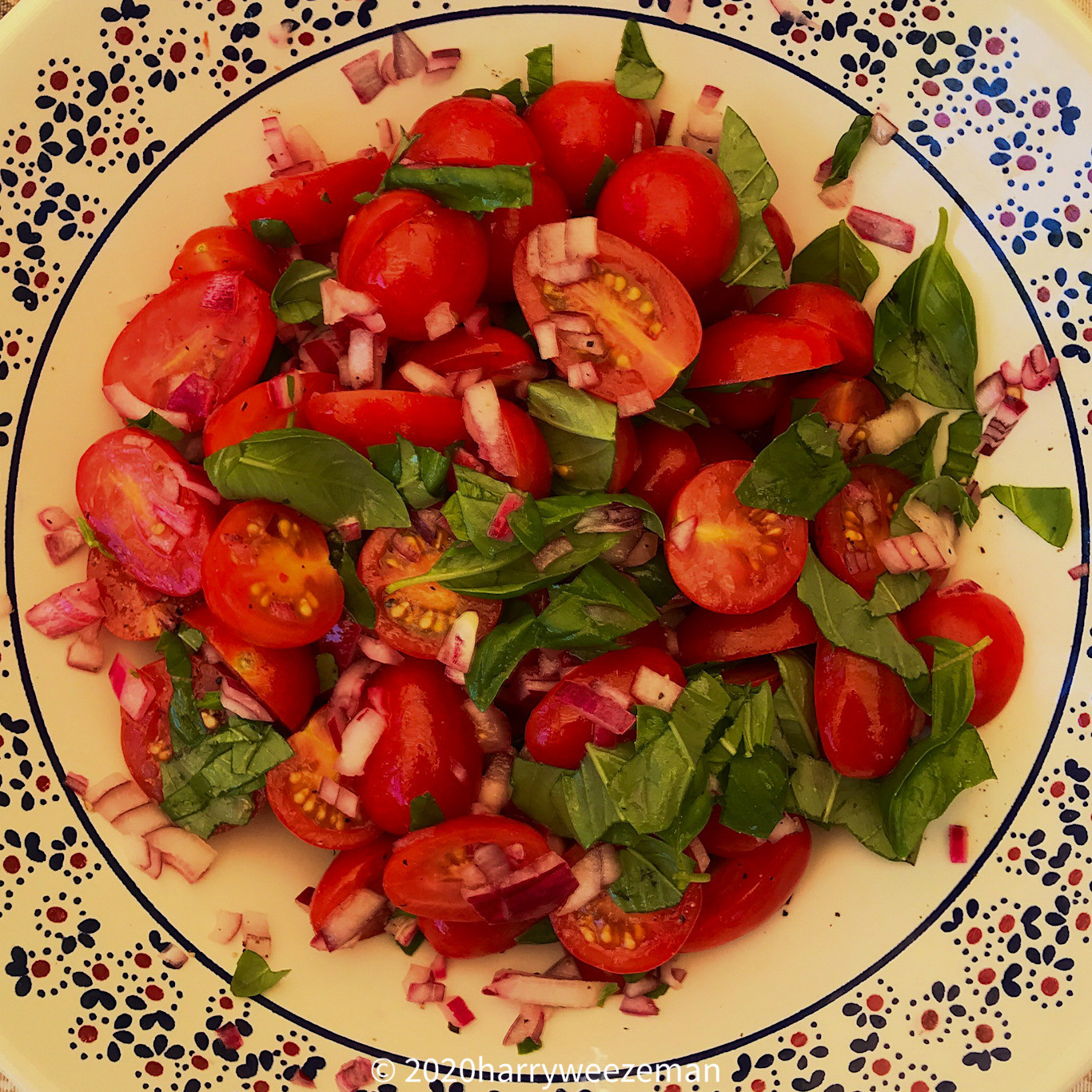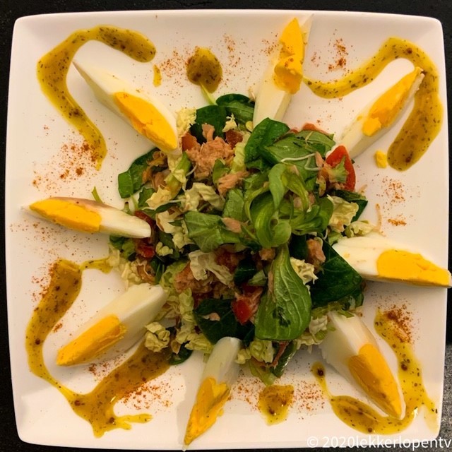 Doe de dressing die bestaat uit een el olijfolie en een el balsamico en peper bij de salade en haal alles weer even door elkaar, nu nog de olijven erbij. Schep de salade op kleine bordjes, leg er het ei in vieren gesneden bij en smullen maar.