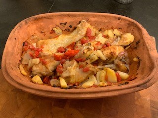 Verdeel wat van de groenten over de bodem van de schaal en leg hier de kippenpoten op. Doe de rest van de ui, tomaat, aardappel, paprika hier overheen en pers er de teentjes knoflook over uit. Deksel erop en 90 minuten in de oven op 200 graden.